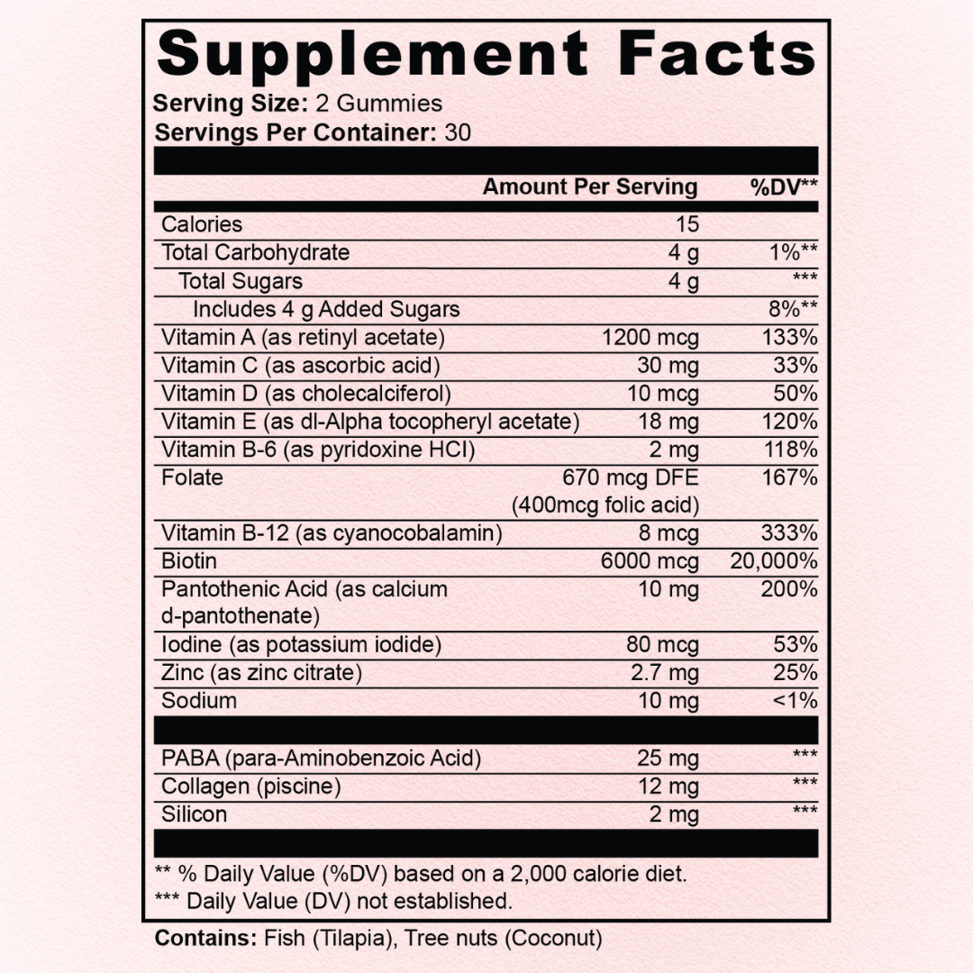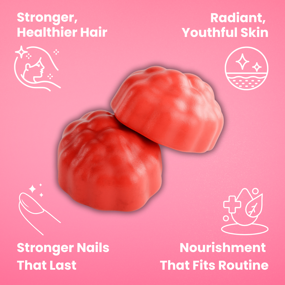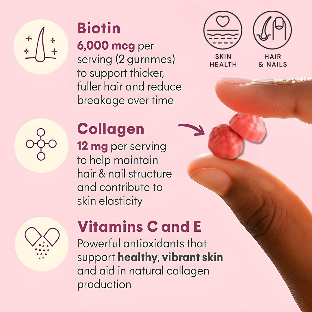Our gummies combine high-dose Biotin, Collagen, and essential vitamins in a tasty, vegan-friendly formula. They’re made with clean ingredients and designed to deliver visible results.